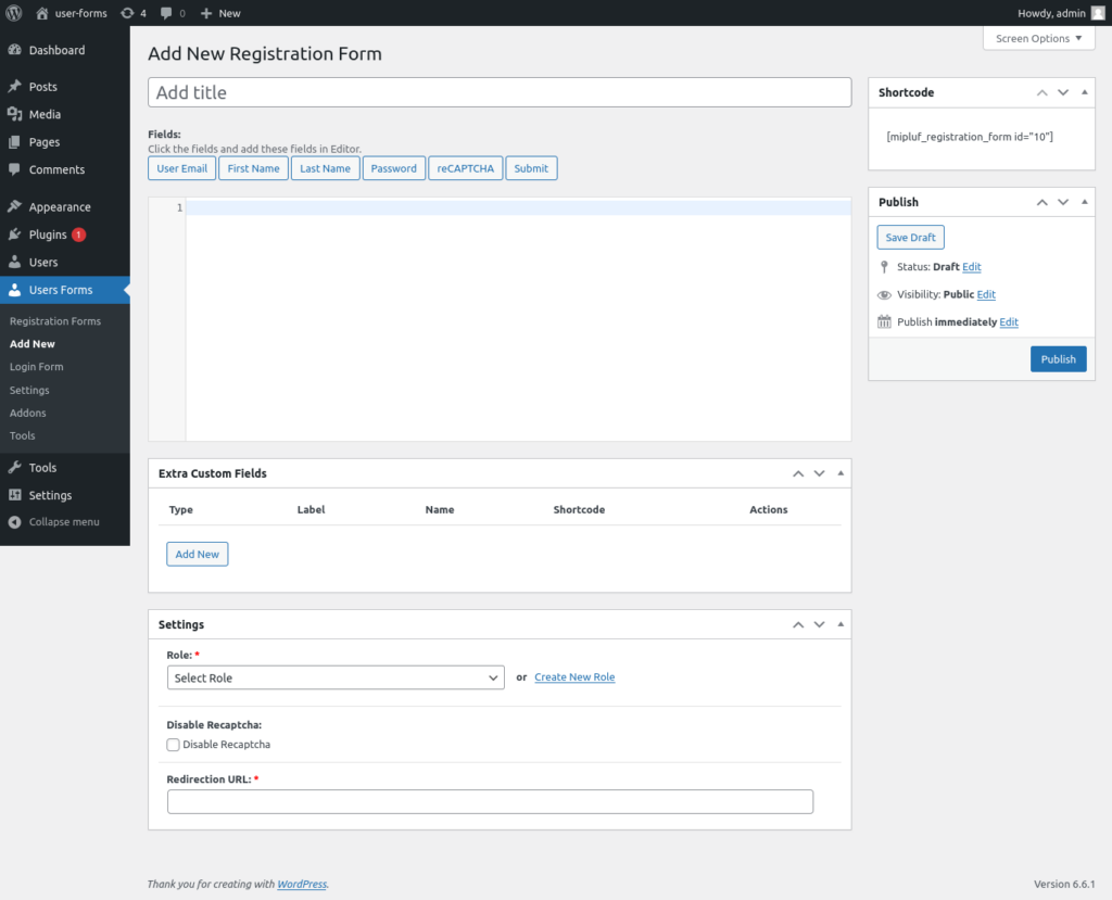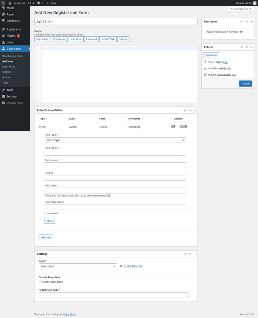 If you want to create custom fields for the registration form, click the “Add New” button inside the custom field meta box and create the custom fields as you want.