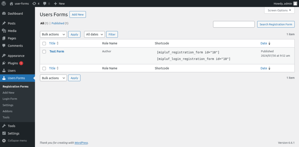 After creating the form, click the “Registration Forms” button to return to the forms listing. The shortcodes are available in the “Shortcode” column; copy the desired shortcode from there.