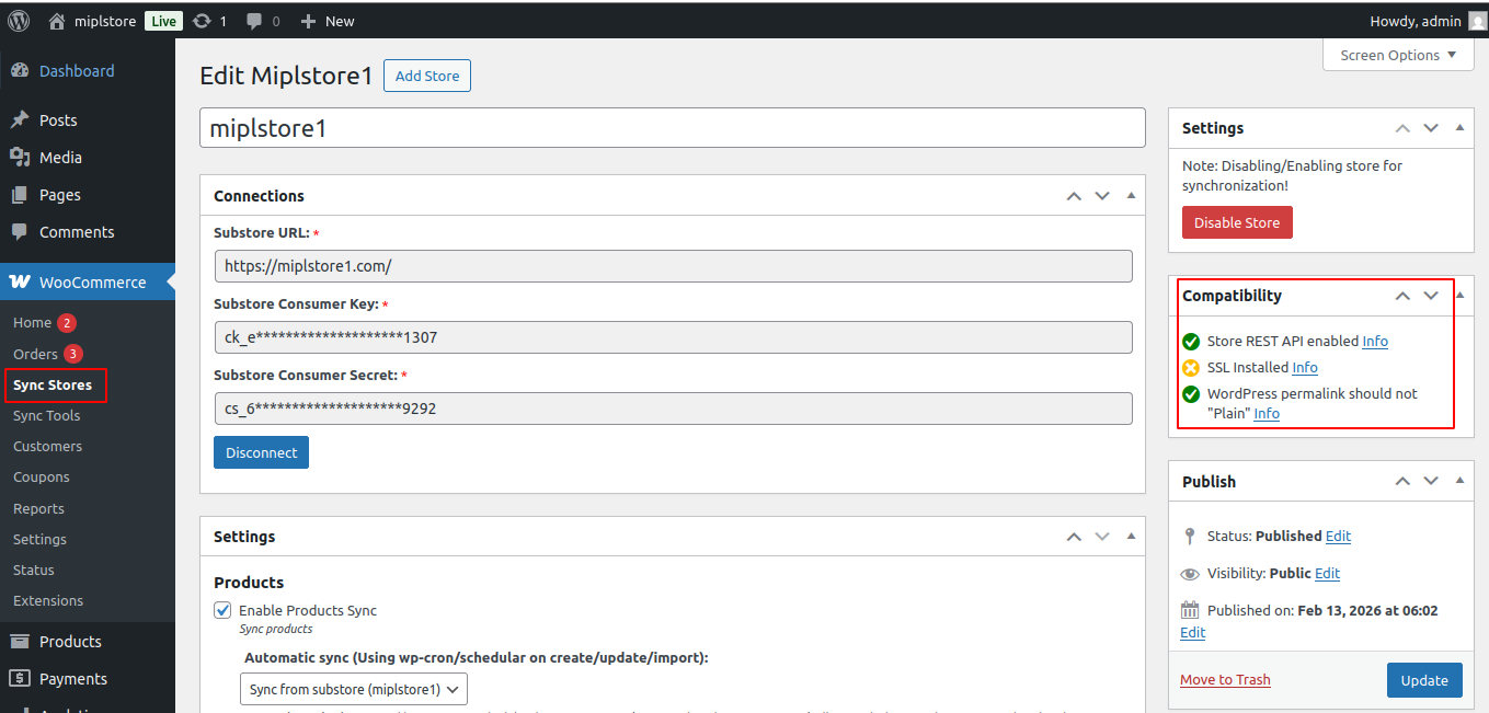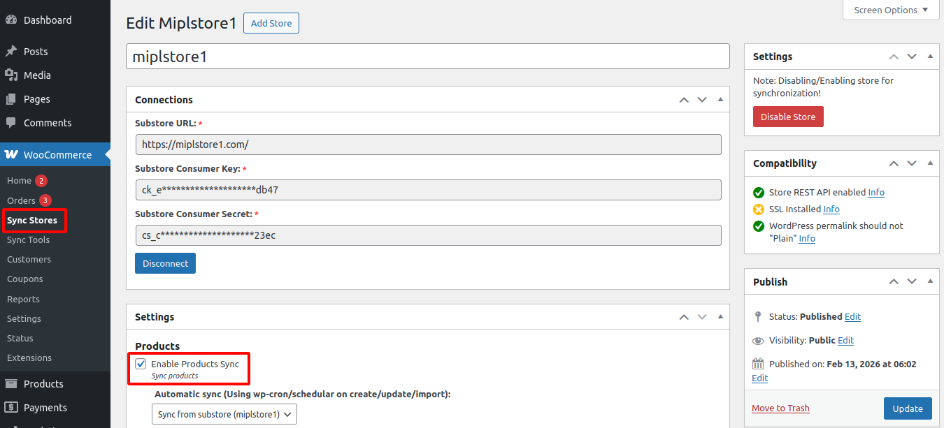 To sync products between the main store and the substore, go to WooCommerce → Sync Stores and edit the store.