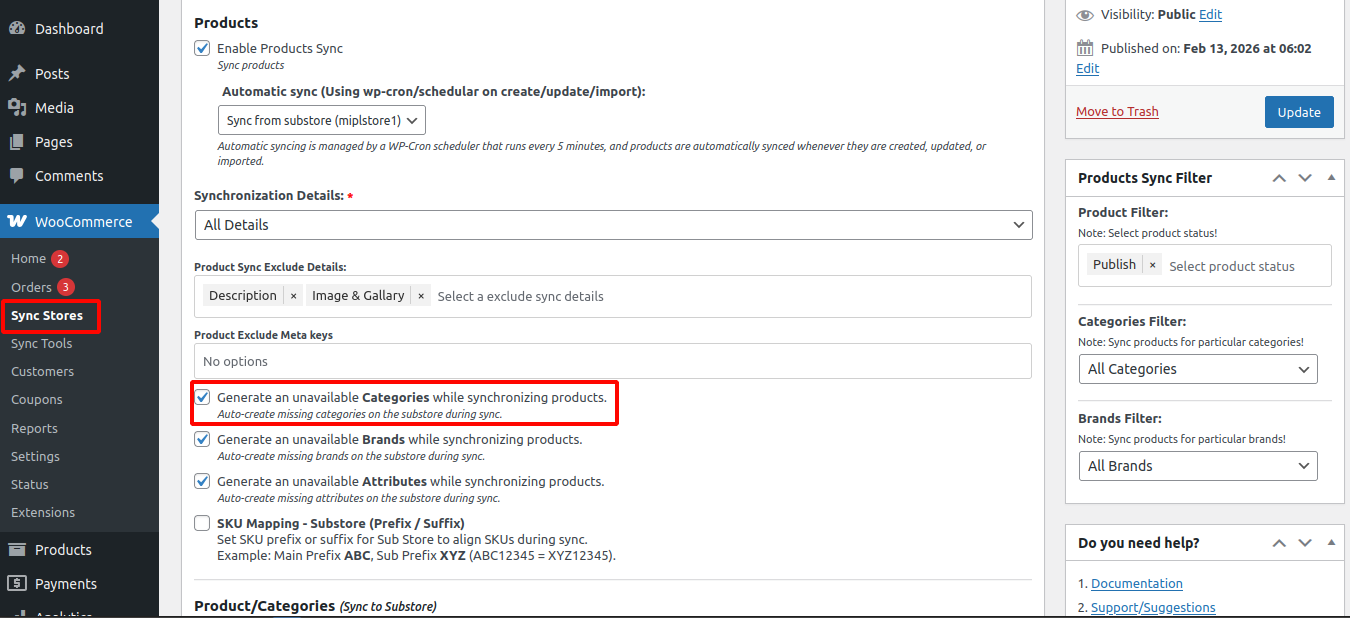 5. Generate Missing Categories : Automatically creates categories on the sub-store if they don’t exist during product syncronization