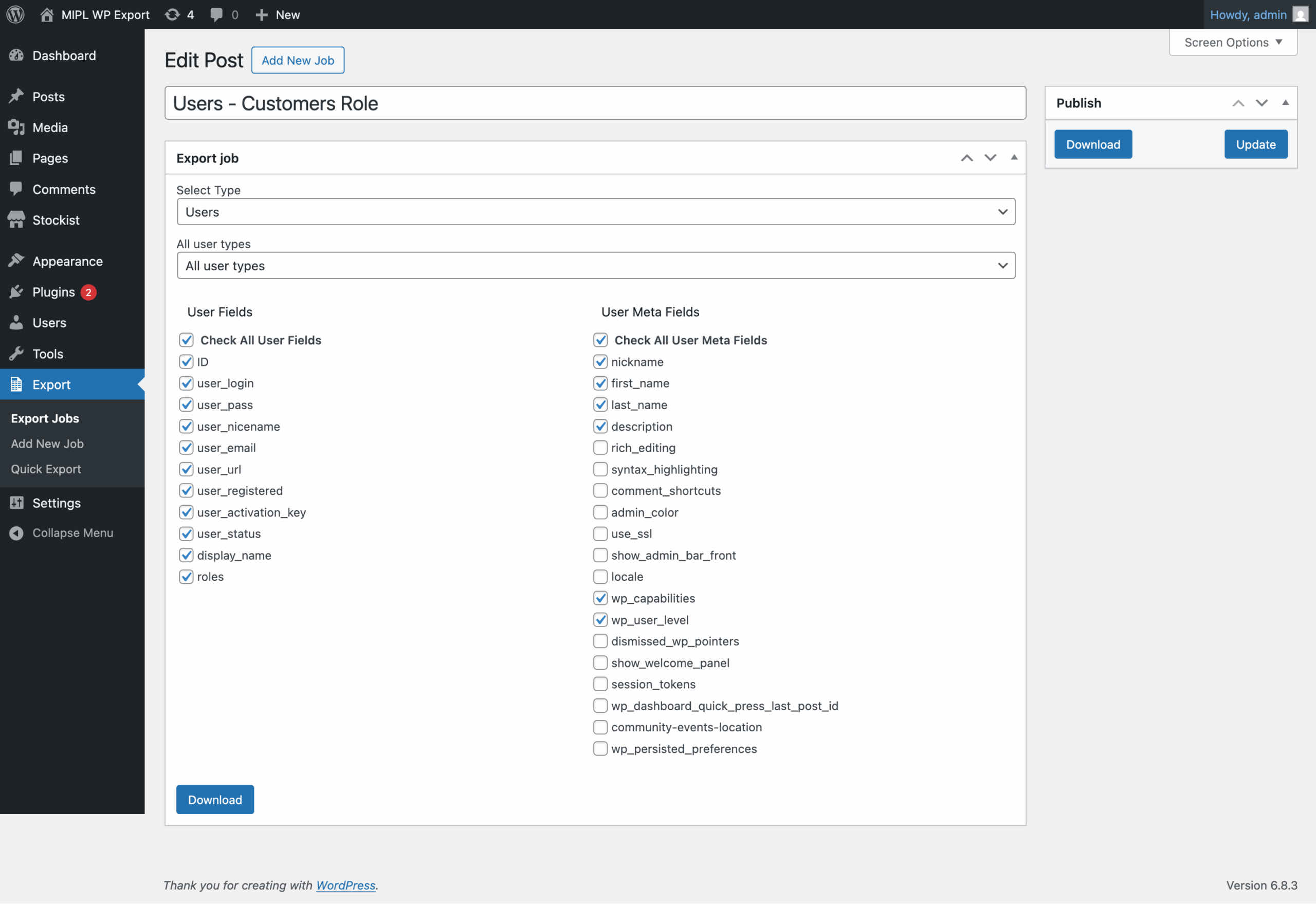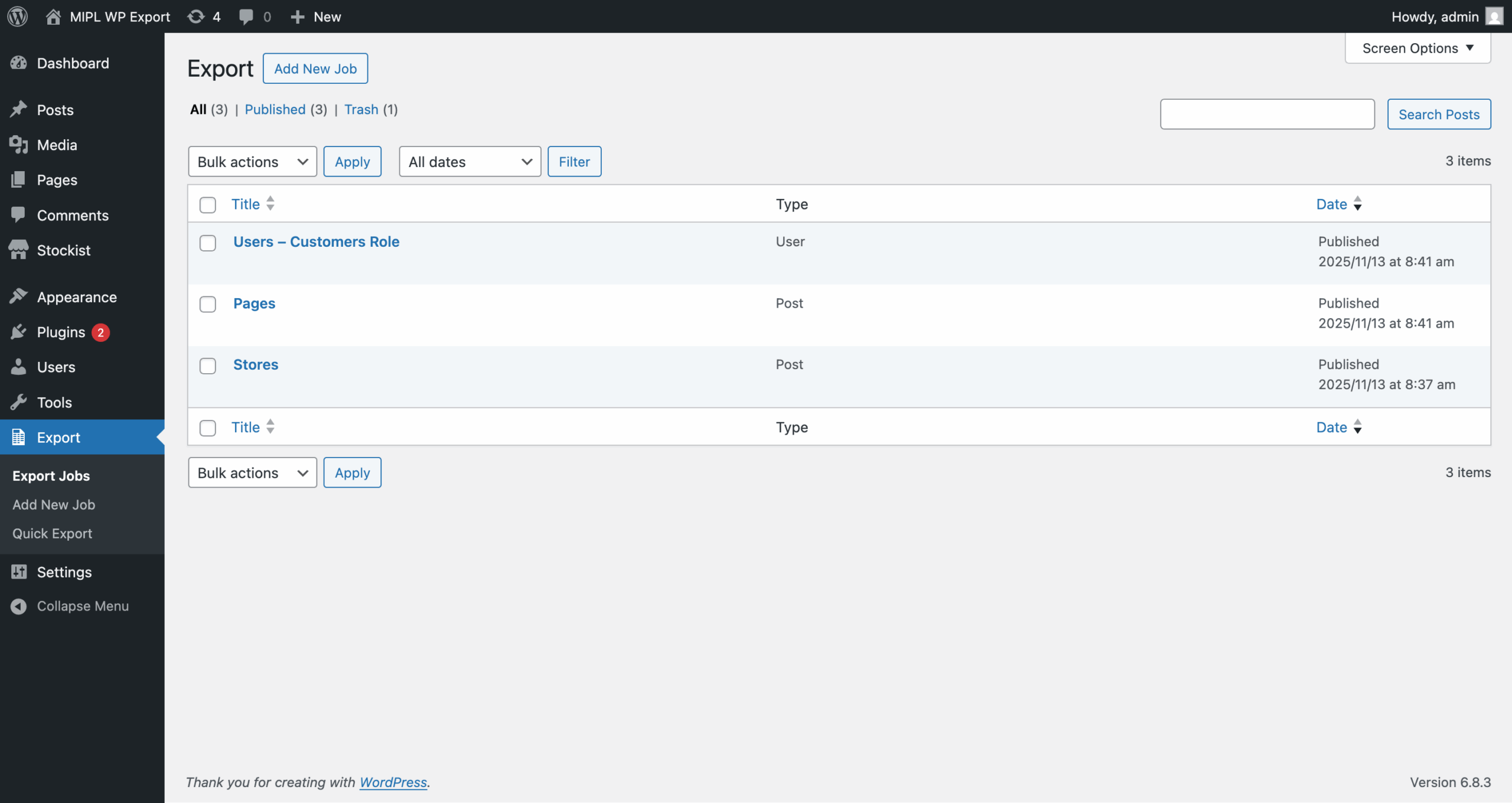 Create Export Jobs – Build and save reusable export profiles for recurring tasks. Configure post types, taxonomies, and filters exactly as you need.